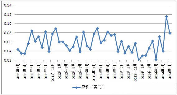 201603081531215438 2011-2014.9我國對俄羅斯LED器件(發光二極管)出口單價變化