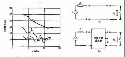 設置電磁干擾濾波器加入前后傳輸到負載上的噪聲電壓分別為U1和U2,計算公式是20lgU1/U2。