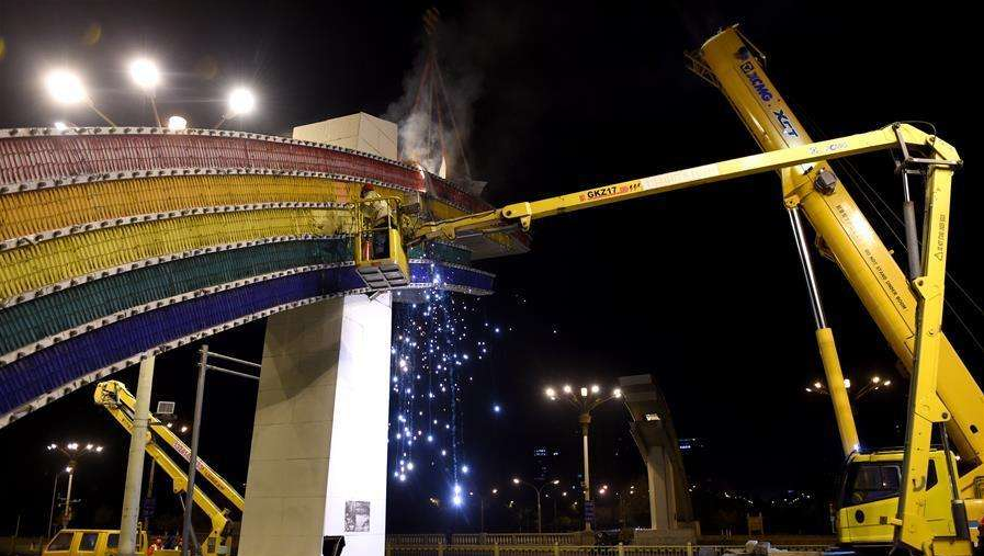 按照施工方案,彩虹門拆除重建工程包括拆除現(xiàn)有結(jié)構(gòu)、基礎(chǔ)施工、鋼結(jié)構(gòu)制作安裝和燈具設(shè)施安裝。為大限度縮短工期,新建彩虹門的鋼結(jié)構(gòu)制作與現(xiàn)場基礎(chǔ)施工并行開展。工期方面,11月25日零時至12月4日,拆除兩座現(xiàn)有彩虹門結(jié)構(gòu);2018年1月16日前完成新建彩虹門鋼結(jié)構(gòu)施工,2018年1月31日前完成裝飾及燈具、機電等設(shè)施安裝。